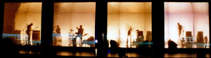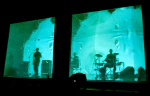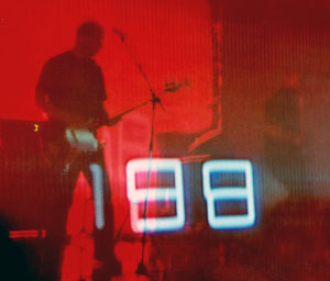 To the shrine of the nomads the pilgrims are flocking, and it was the best part of an hour later by the time all the pilgrims were rewarming their seats eagerly awaiting the Send set. What we were greeted with can only be described as an arresting sight. In appearance unique, from 'People In A Room' to people in rooms, four boxes, approximately 15-foot square, akin to miniature theatres, each housing a member of the group, were arranged in a row across the stage. The set began with 99.9, while projections of ECG waves with corresponding numerical readouts of each player was projected on the surface of the boxes. At one point, providing a nice bit of unintentional conceptual continuity, BCG's ECG hovered briefly around the 99 mark... Wire were in their element now, as they leapt headlong into the songs as if to say, "Yeah, that was us then, but look at us now! Watch us burn! This is where we're really at! Look out below!"