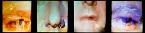 The front projections were now augmented with rear ones of synaptic activity within the brain. These were not the band's brainwaves, as that would have exceeded budget limitations. This was generic footage, which created a nice continuity of image across the boxes, each projection reflected fourfold within the foil lined inner facets of the boxes, creating interesting Rorsharch effects. Then, continuing the idea of isolating elemental material, images of parts of the band's faces were projected on the front of the boxes. Graham's right eye and Bruce's left eye appeared stage right and left, casting a cold eye on the crowd, like two silent sentinels. Graham's bloodshot eye was like a massive Photoshop icon made flesh. Bruce's jaded eye seemed like a world-weary witness that's seen it all. Whilst Robert's nose sniffed us out, Colin's mouth demanded our attention, as he sung in sync to a prerecorded video. Well, mostly in sync. It only slipped significantly out of register a couple of times, which was a shame, as the effect was powerful. Still, can't have been easy. It was like some absurd take on Beckett's Not I. But instead of a breakneck pace, manic monologue in the third person, we got a hectoring, defiant diatribe, delivered with a palpable anger that was reflected/intensified by the deep red that flushed the boxes at certain points, whilst the music continued at breakneck pace... keep on repeating, repeating a chord... If the music on Pink Flag appears stripped, then the Send material is about as bald as it gets.